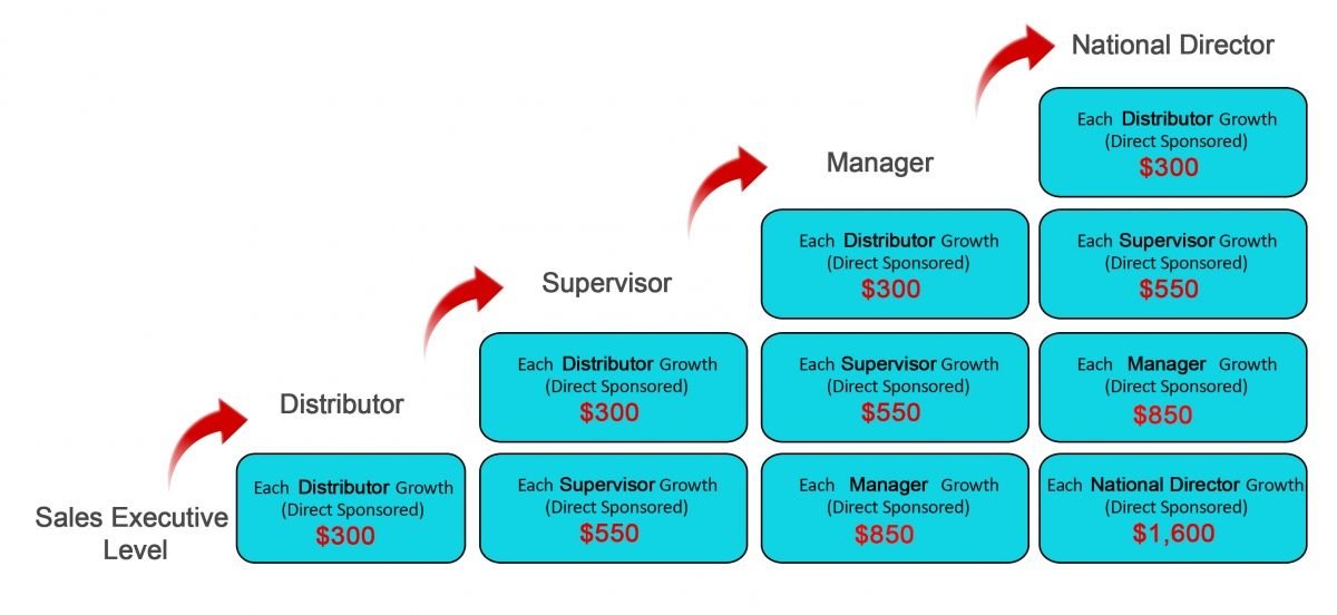 A Manager can personally have at least 26 qualified Sales Executive Levels (SEL), as well as personally sponsored 4 qualified Distributor’s (each of whom has personally sponsored at least 6 qualified SEL’s), as well as personally sponsored 3 Supervisor’s (each of whom has the minimum qualifying Team structure).Each time a Manager produces a “DIRECTLY SPONSORED” Distributor or Supervisor or Manager within their Team, they earn a once-off “PROMOTION” bonus of $300 or $550 or $850 respectively. These “promotion” bonuses have no time limit, and is paid every time they promote a directly sponsored Distributor, Supervisor, or Manager.